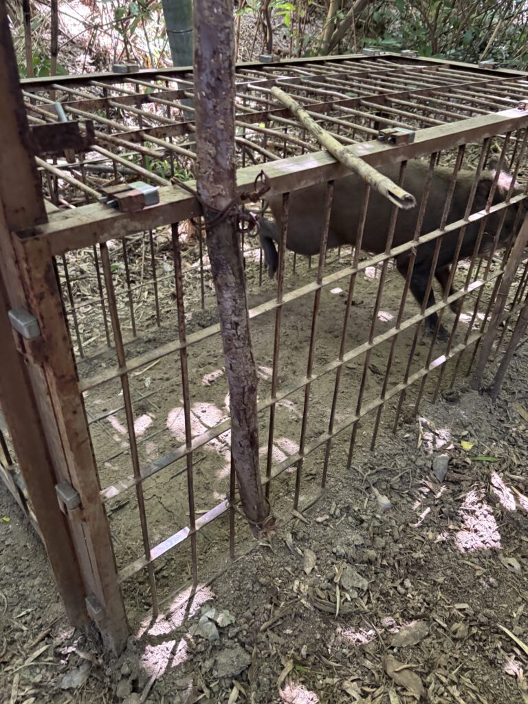 日陰の日の当たらない場所の箱罠にかかった猪2頭は明日駆除することとなりました。