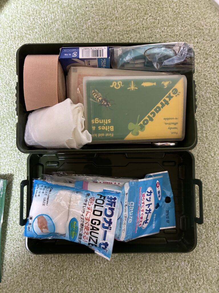 中身は大きめのカットバンにガーゼ、包帯、テーピング。これに加えてここのブログでも過去にご紹介した蛇やスズメバチなど毒を吸い出すポイズンリムーバー。