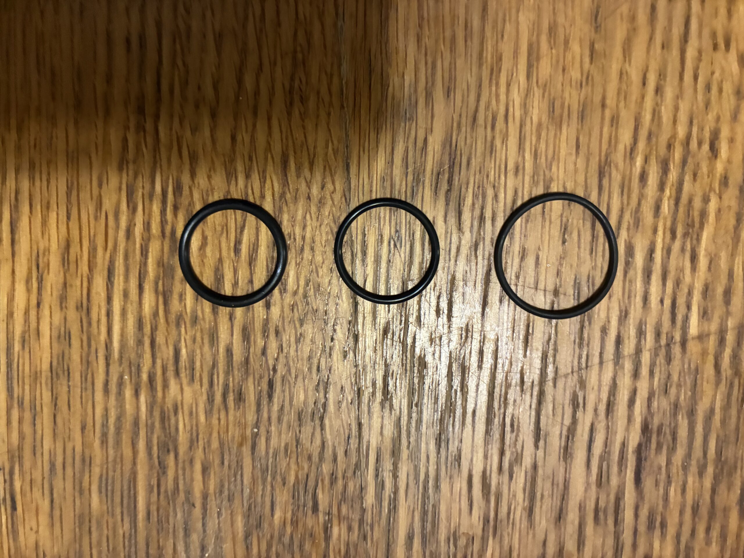 真ん中が今回発注したOリング。右が元々銃についていたもの。左がホームセンターの水回り用Oリングです。